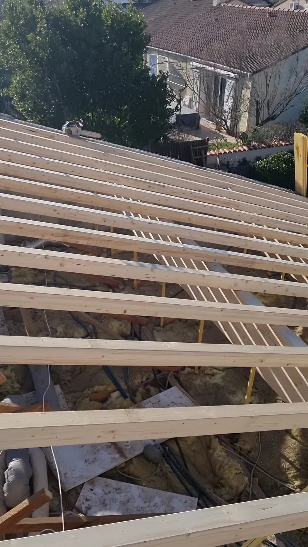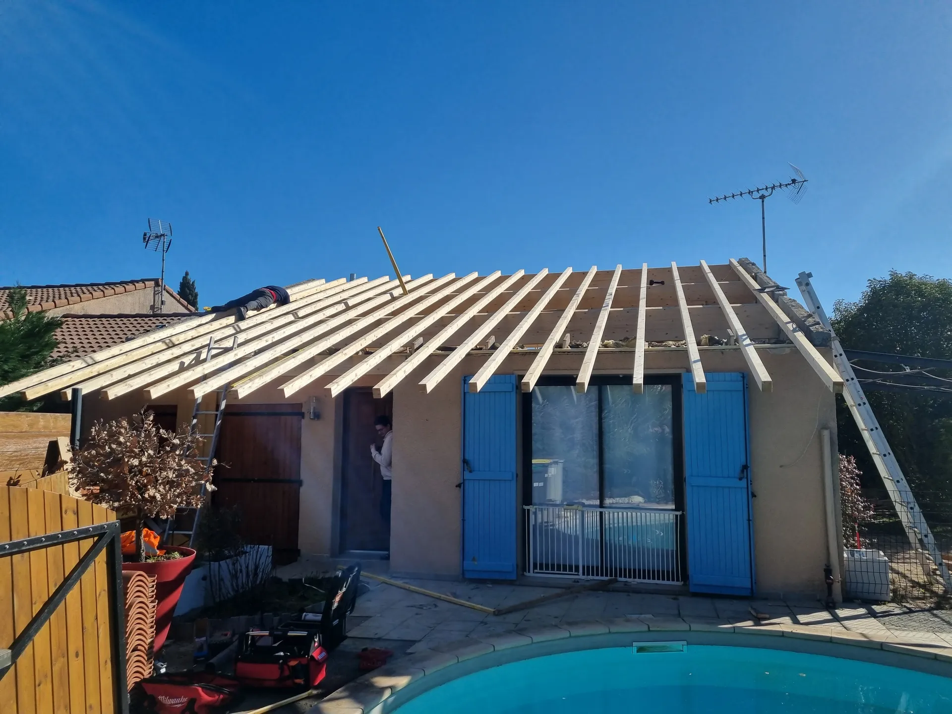 Sur ce chantier à Miramas, nous avons procédé à l’installation d’une charpente bois neuve avec voliges parfaitement ajustées afin d’assurer un support solide pour la future couverture. La pose de charpente neuve à Miramas permet de repartir sur une structure saine, résistante aux charges et aux variations climatiques.